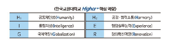 한국교원대는 교육 4.0 시대를 이끌어갈 교육자 양성을 위해 갖춰야 할 Higher+ 6대 핵심역량을 선정하고 창의혁신적인 학부교육 모델을 구축·확산할 계획이다. 이를 위해 ‘공동체 인성과 실천적 인성을 갖춘 교사 교양교육과정’, ‘수업전문성 기반 창의혁신 전공교육과정’, ‘타인 존중과 공감 소통 역량 함양을 위한 비교과교육과정’을 운영해 학부교육 지원 시스템 개선을 추진한다. 특히 안전, 소통, 상담 역량 및 학교 현장 실무 협력 능력을 갖춘 교사 양성, 융·복합 교육과 컴퓨팅 사고력 함양에 중점을 두고 있다.