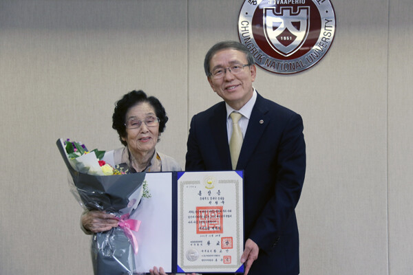 [대학저널 이희재 기자] 충북대학교(총장 윤여표)가 아낌없는 나눔을 실천한 장학 할머니 전정숙 여사에게 훈장과 꽃다발을 전달했다.