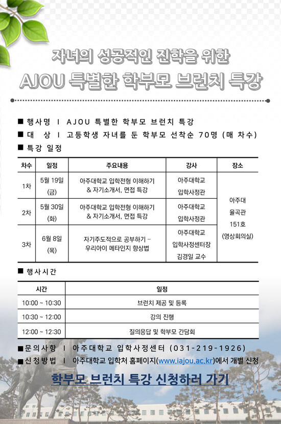 [대학저널 신효송 기자] 아주대학교(총장 김동연)가 오는 5월 19일, 30일, 6월 8일에 고교생 자녀를 둔 학부모를 대상으로 '학부모 브런치 특강'을 개최한다.