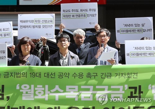 이에 대해 한국학원총연합회 이병래 부회장은 "대선 기간 동안 사교육걱정없는세상 같은 교육시민단체들이 문 후보에게 (학원 휴일 휴무제 도입과 학원 심야 영업시간 제한 등의) 문제를 꾸준히 제기하고 강요했다"며 "하지만 이러한 부분을 법제화하는 것은 위헌 소지가 있다. 학생들의 건강권, 수면권이 물론 중요하지만 학생들의 학습권, 학부모들의 교육권, 학원운영자들의 자율권도 중요하다는 것을 알아야 한다"고 반박했다.