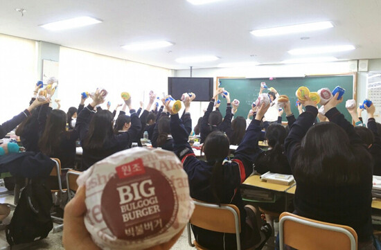 수업이 한창인 한 고등학교 교실 안. 선생님의 설명에 학생들이 집중하는 가운데 교실문이 열리고 상자 한 가득 햄버거와 콜라 등이 들어온다. 수업을 듣던 학생들은 일제히 환호성을 지른다.