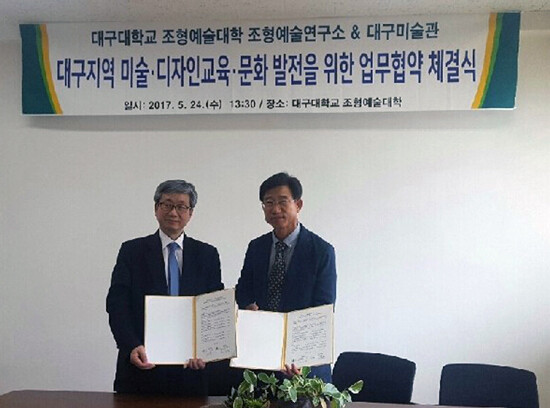 [대학저널 유제민 기자] 대구대학교(총장 홍덕률) 조형예술대학이 지난 24일 대구대 2호관 건물 학장실에서 대구미술관(관장 최승훈)과 대구지역 미술·디자인교육·문화 발전을 위한 업무협약을 체결했다.