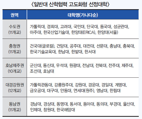 '일반대 산학협력 고도화형'에는 ▲가톨릭대, 경희대, 고려대, 국민대, 단국대, 동국대, 성균관대, 아주대, 한국산업기술대, 한양대 ERICA , 한양대 서울(이상 수도권) ▲건국대 글로컬, 건양대, 공주대, 대전대, 선문대, 충남대, 충북대, 한국기술교육대, 한남대, 한밭대, 한서대(이상 충청권) ▲군산대, 동신대, 우석대, 원광대, 전남대, 전북대, 전주대, 제주대, 조선대, 호남대(이상 호남·제주권) ▲가톨릭관동대, 강릉원주대, 강원대, 경운대, 경일대, 계명대, 금오공대, 대구대, 안동대, 연세대 원주, 영남대, 한림대(이상 대경·강원권) ▲경남대, 경상대, 동명대, 동서대, 동아대, 동의대, 부경대, 울산대, 인제대, 창원대, 한국해양대(이상 동남권) 등 55개 대학이 선정의 영예를 안았다.