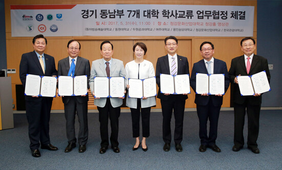 체결식은 청강문화산업대학교에서 열렸다. 윤준호 여주대 총장, 최성식 용인송담대 총장, 이수형 청강문화산업대 총장, 김준원 동아방송예술대 총장, 모영기 동원대 총장, 이해구 두원공과대 총장, 김성이 한국관광대 총장을 비롯한 경기 동남부대 교무학사 교직원 30여 명이 참석했다.