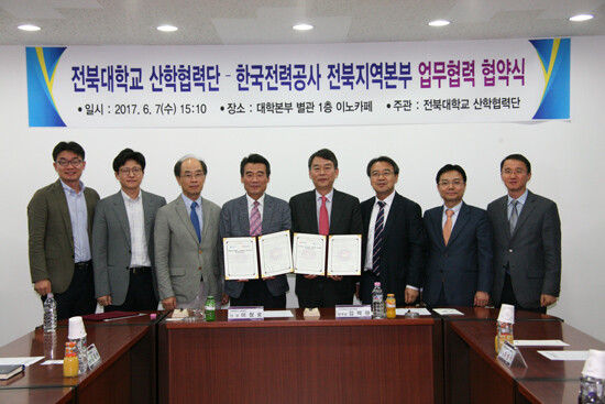 전북대 산학협력단과 한전 전북지역본부는 지난 7일 전북대 본부별관 1층 이노카페에서 업무협력 협약을 체결했다.