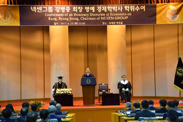 [대학저널 신효송 기자] 한국외국어대학교(HUFS, 총장 김인철)가 13일 한국외대 서울캠퍼스 애경홀에서 강병중 넥센그룹 회장에게 한국외대 명예박사학위를 수여했다.