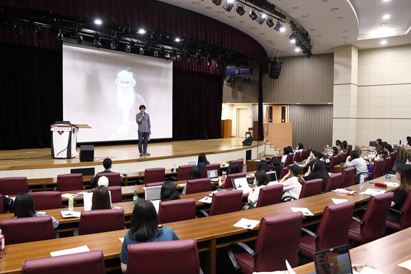 오종우 교수는 이날 러시아 문학의 거장인 톨스토이의 문학을 소개하며 '인공지능시대, 인간의 격(格)'이라는 주제로 강연을 열었다. 오 교수는 선과 위선을 대립시킨 톨스토이의 작품세계를 언급하며 "사회를 파괴하는 것은 '악'이 아니라 '위선'"이라고 말했다. 그는 "위선은 겉으로는 선을 닮았기 때문에 사람들의 판단력을 흐리게 한다"라며 "위선을 통해 자신의 생각만을 강화하다 보면 결국 자기 유폐와 자기 망상에 빠지게 된다"라고 설명했다. 이어 "자신의 단점을 인정하고 더 넓은 세계를 만나서 내 세계를 만들어 나갈 때 자신을 확장할 수 있다"라고 강조했다.