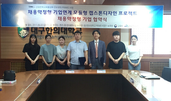 이날 협약식에는 대구한의대 프라임사업단 박진한 부단장, 김동호 팀장과 Mannay Asia R&D Center 곽재훈 소장, 기업모듈형 캡스톤디자인 프로젝트 팀 '쿠잉' 등이 참석했다.
