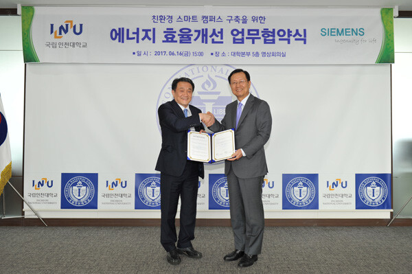 [대학저널 신효송 기자] 인천대학교(총장 조동성)와 지멘스㈜ (회장 김종갑)가 16일 '친환경 스마트 캠퍼스 구축을 위한 양해각서(MOU)'를 체결했다.
