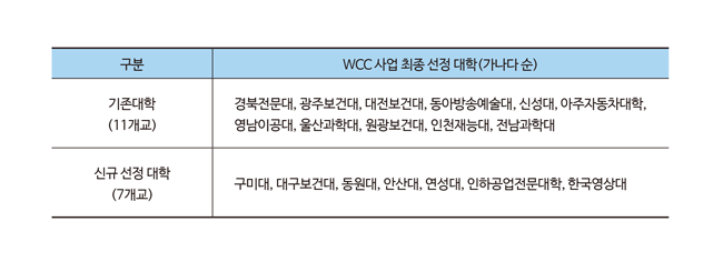교육부와 한국연구재단은 29일 WCC 사업 성과평가·신규 선정평가 결과를 발표했다. 발표에 따르면 경북전문대, 광주보건대, 대전보건대, 동아방송예술대, 신성대, 아주자동차대학, 영남이공대, 울산과학대, 원광보건대, 인천재능대, 전남과학대 등 11개 기존 대학을 비롯해 구미대, 대구보건대, 동원대, 안산대, 연성대, 인하공업전문대학, 한국영상대 등 7개 신규 대학이 사업에 선정됐다.