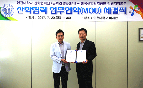 [대학저널 신효송 기자] 인천대학교(총장 조동성) 산학협력단(단장 김영관)과 한국산업단지공단 강원지역본부(본부장 김흥수)가 20일 인천대 미래관에서 상호 협력을 위한 업무협약을 체결했다.