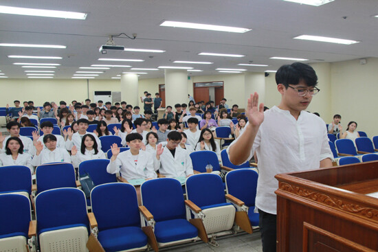 올해 30회째 맞이하는 이날 한방의료 봉사단 발대식은 박종현 한의학과 학과장의 사회로 한의과대학 김광중 학장의 격려사, 변성희 부학장의 팀 구성 및 현황 설명, 박문환 학생대표의 선서식 순으로 진행됐다.
