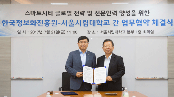 이 날 협약 체결식에는 원윤희 서울시립대 총장, 한만희 국제도시과학대학원장과 서병조 한국정보화진흥원장 등 양기관의 주요 인사가 참석했다.