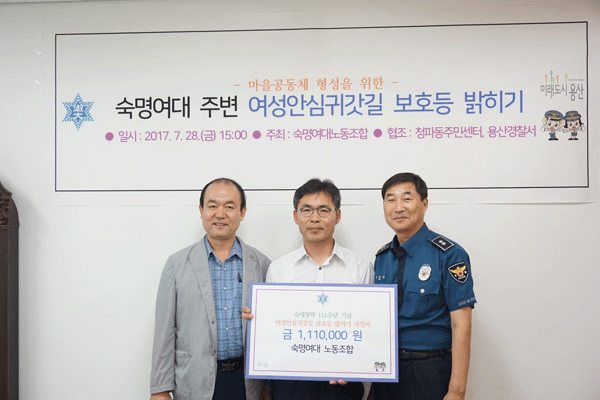 숙명여대 노동조합은 지난 28일 용산구 청파동 주민센터 및 용산경찰서와 함께 '숙명여대 주변 안심귀갓길 보호등 밝히기 협약'을 개최했다.