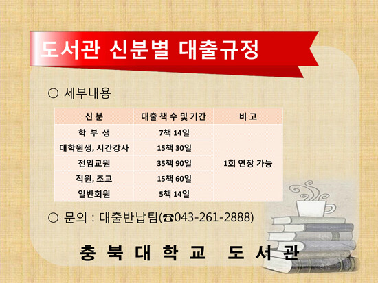 [대학저널 이희재 기자] 충북대학교(총장 윤여표) 도서관이 독서문화 확산 및 연구기반 확대를 위해 도서관 대출규정을 개정한다.