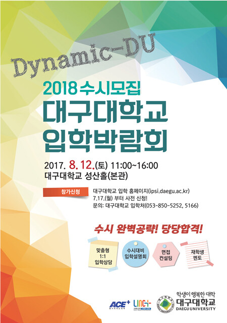 [대학저널 유제민 기자] 대구대학교(총장 홍덕률)는 오는 12일 오전 11시부터 오후 4시까지 대구대 경산캠퍼스 성산홀(본관)에서 대규모 수시모집 입학박람회 행사를 연다.