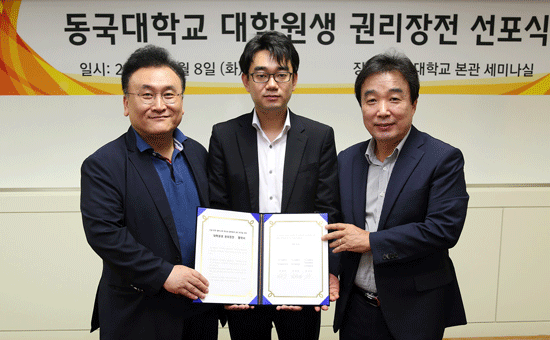 동국대는 지난 8일 교내 본관 2층 세미나실에서 동국대 일반대학원 총학생회와 함께 '대학원생 권리장전' 선포식을 가졌다. 선포식에는 윤성이 일반대학원장, 김상겸 인권센터장, 서정호 일반대학원 총학생회장 등 동국대 관계자 20여 명이 참석했다.