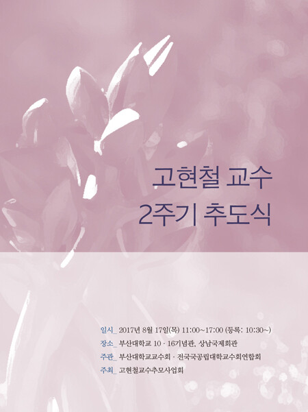 부산대 '고현철 교수 추모사업회'는 故 고현철 교수의 2주기인 오는 17일 오전 11시 부산대 '10.16기념관'에서 '故 고현철 교수 2주기 추도식'을 개최한다. 추도식에는 유가족과 부산대 교수 및 학생·직원 등이 참석한다. 특히 올해 2주기 추도식에는 김상곤 부총리 겸 교육부장관이 참석할 예정이어서 주목받고 있다.