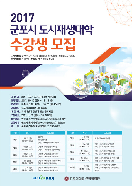 이번 위탁 운영의 책임을 맡고 있는 한광식 김포대 산학협력단장은 "이번 군포시 도시재생대학 과정을 통해 군포시 주민과 함께 지역의 문제점을 파악하고 바람직한 방향과 대안을 마련, 군포시 도시재생 전략에 중요한 밑그림을 그리는 계기를 만들겠다"고 말했다.