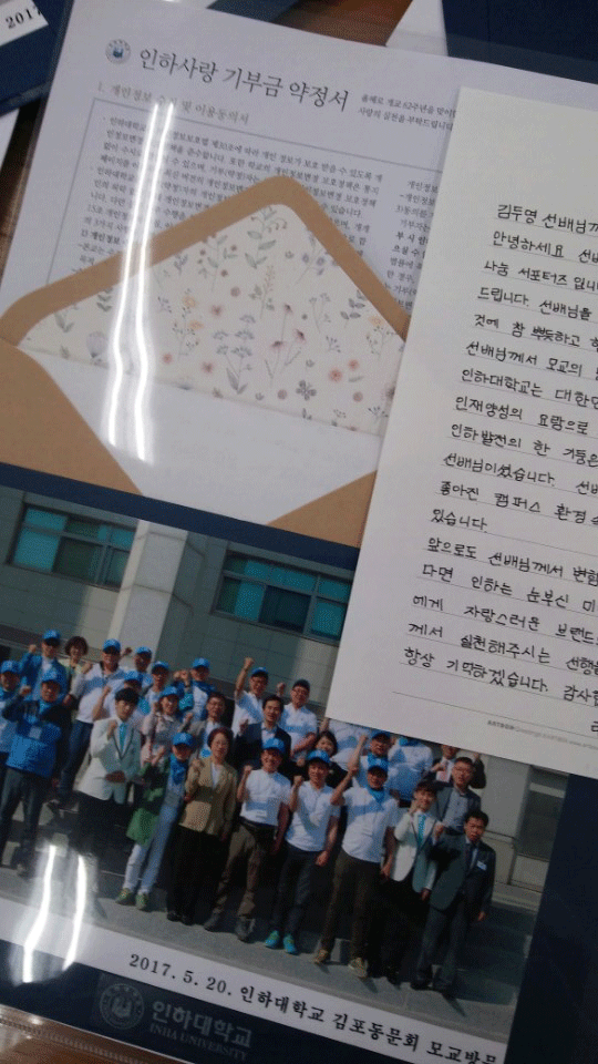 [대학저널 신효송 기자] 인하대학교(총장 최순자) 발전기금 홍보대사 '럽인 나눔 서포터즈'가 최근 학교에 발전기금을 전달한 천안에 살고 있는 동문에게 손편지 한 장을 보냈다.