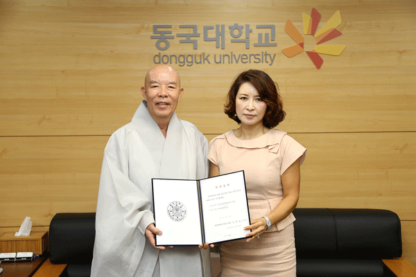 이날 동국대 행정대학원 제97기 졸업생 김명옥 회장(사회복지법인 국제연꽃마을 부회장), 변창윤 수석고문(서울중구의회 의원) 등 8명은 동국대 한태식 총장을 찾아 발전기금을 직접 전달했다.