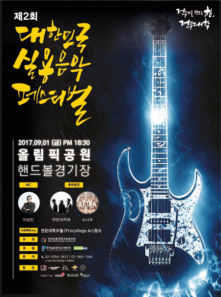 [대학저널 유제민 기자] 한국전문대학교육협의회(회장 이기우 인천재능대학교 총장. 이하 전문대교협)는 오는 9월 1일 오후 6시 30분 서울 올림픽공원 핸드볼경기장에서 '2017 제2회 대한민국 실용음악 페스티벌' 결선을 개최한다.