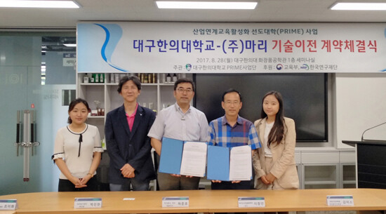 대구한의대 PRIME사업단은 지난 28일 대구한의대 화장품공학관 세미나실에서 (주)마리(대표이사 하준호)와 기술이전 계약체결식을 가졌다. 이번에 이전된 기술은 물리적 필링과 화학적 필링이 동시에 이뤄져 피부 표면의 묵은 각질을 제거, 매끄럽고 부드러운 피부로 만들어 주는 하이브리드 필링겔 기술이다.