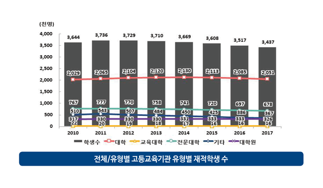 일반대학은 205만 619명으로 3만 4188명(1.6%↓), 교육대학은 1만 5839명으로 64명(0.4%↓), 전문대학은 67만 7721명으로 1만 9493명(2.8%↓), 기타(산업대학, 방송통신대학, 사이버대학, 기술대학, 각종학교, 전공대학, 원격대학 형태의 평생교육시설, 사내대학 형태의 평생교육시설, 기능대학 포함)는 36만 6815명으로 1만 9100명(4.9%↓)이 감소, 모든 유형에서 감소(방송통신대학이 1만 2382명 감소해 기타 감소 비중의 64.8%를 차지)했다. 대학원(대학원대학 포함)의 재적 학생 수는 32만 6315명으로 전년 대비 6453명(1.9%↓) 감소했다.