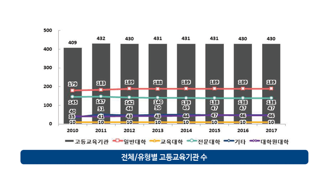 전체 고등교육기관 수는 430개교로 전년과 동일하며, 각 유형별 고등교육기관 수(일반대학 189개교, 교육대학 10개교, 전문대학 138개교, 기타 47교, 대학원대학 46개교) 역시 변동이 없는 것으로 나타났다.