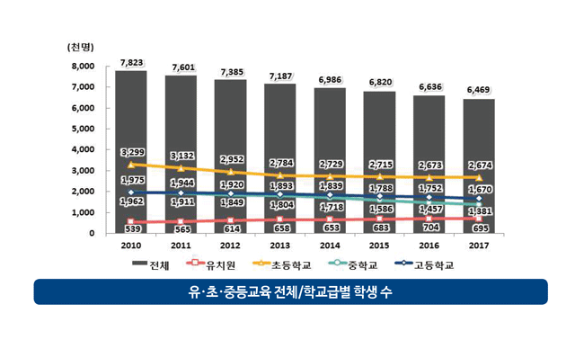 교육부(부총리 겸 교육부장관 김상곤)와 한국교육개발원(원장 김재춘)은 31일 '2017년 교육기본통계' 조사결과를 발표했다. 이는 전국 유·초·중·고등 교육기관의 학교, 학생, 교원, 시설 현황 등을 지난 4월 1일을 기준으로 조사한 것이다.