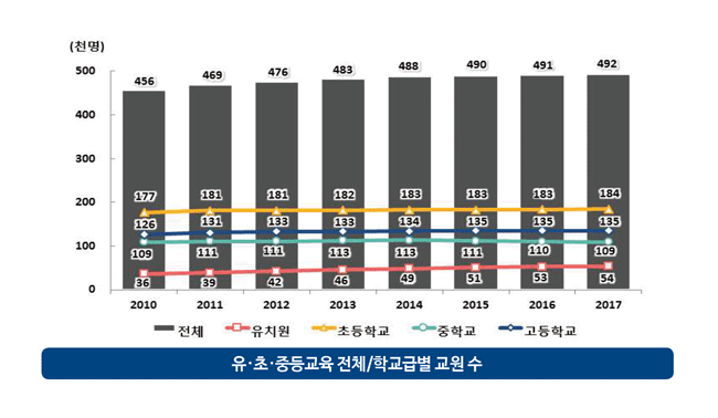 전체 유‧초‧중등학교 교원 수는 49만 2187명으로 전년 대비 1035명(0.2%↑) 증가했으며 이 중 초·중등학교 교원 수는 42만 8242명으로 전년 대비 162명 감소했다.