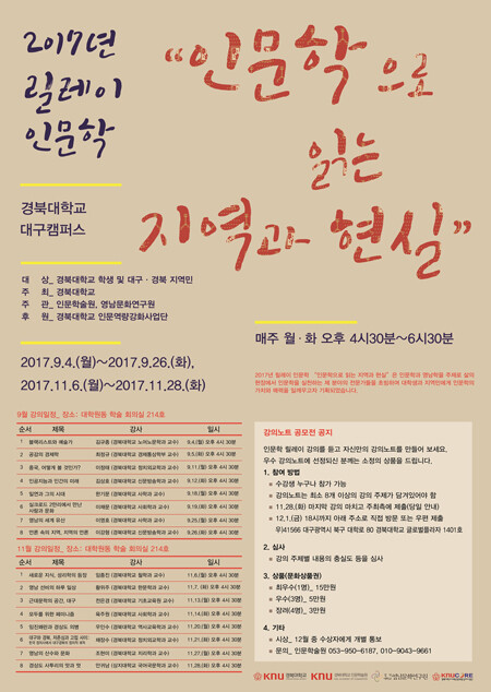 이번 강좌는 경북대가 주최하고 경북대 인문학술원과 영남문화연구원이 공동 주관해 열린다. 9월과 11월 매주 월, 화요일에 경북대 대구캠퍼스와 상주캠퍼스에서 강좌가 진행된다.