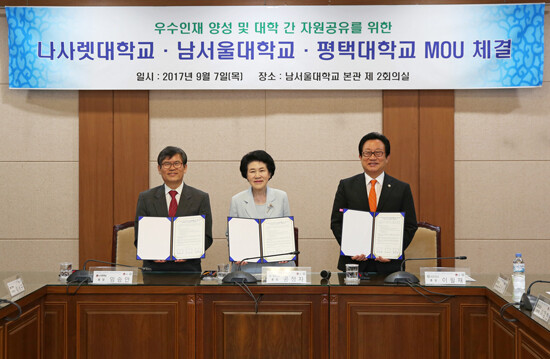 [대학저널 유제민 기자] 나사렛대학교(총장 임승안), 남서울대학교(총장 공정자), 평택대학교(총장 이필재)는 7일 남서울대 본관 1층 국제회의실에서 우수인재 양성과 자원공유를 위해 손을 맞잡았다.