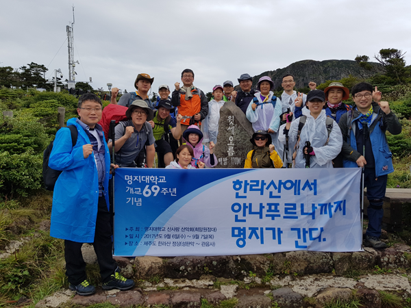 행사명은 '명지대 개교 69주년기념 "한라산에서 안나푸르나까지 명지가 간다"'이다. 산악회 참가자들은 제주도 한라산 선판악탐방로~관음사탐방로를 오른 후 한라산 정상에서 기념행사를 가졌다.