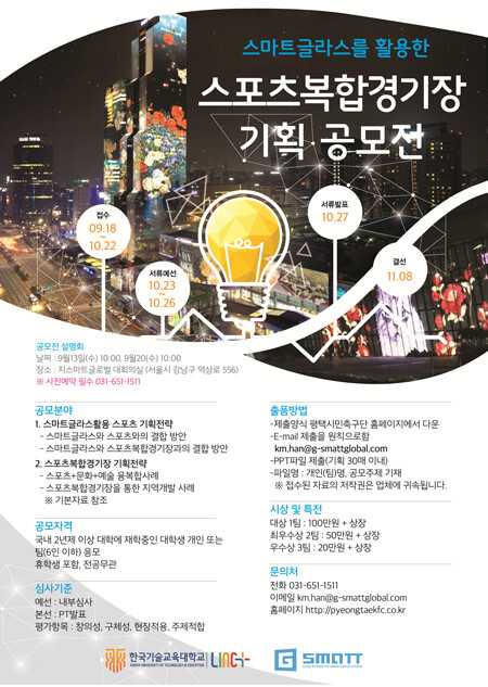 이번 공모전은 지스마트의 스포츠 후원사업 지원을 통해 지역사회 스포츠문화 활성화에 기여하고 비공학 캡스톤디자인 전국 확산에 기여하고자 마련됐다. ▲스마트글라스(건물 외벽의 화려하고 다양한 영상을 뿜어내는 투명전광유리) 활용 스포츠 기획전략 ▲스포츠복합경기장 기획전략 2가지 분야로 나뉘어 열린다.