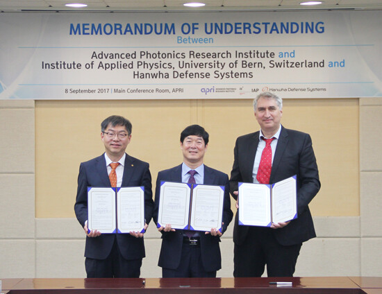 [대학저널 유제민 기자] GIST(총장 문승현) 고등광기술연구소(이하 APRI)는 지난 8일 APRI 대회의실에서 스위스 베른(Bern) 대학 응용물리연구소(IAP, 소장 Prof. Thomas Feurer) 및 한화디펜스(대표 이성수)와 연구협약을 체결했다.