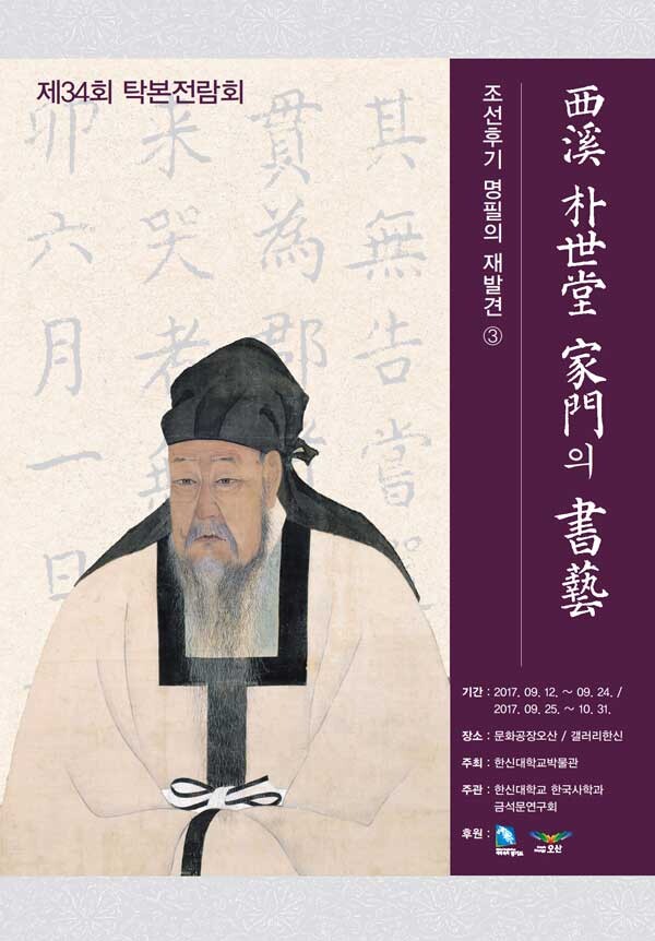 이번 탁본전람회는 '조선 후기 명필의 재발견'이라는 큰 주제 아래, 서계 박세당(1629~1703)과 그 서예관을 이어받은 아들 박태유·박태보, 손자인 박필기·박필모, 사위 이렴 등의 작품을 전시한다. 가문 특유의 서체를 볼 수 있다.