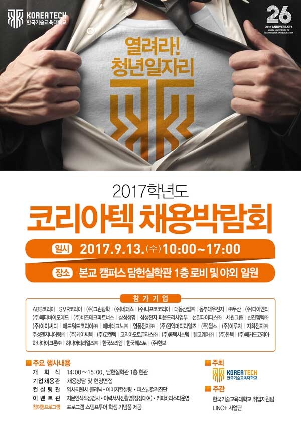 [대학저널 박용우 기자]코리아텍(한국기술교육대학교, 총장 김기영)은 오는 13일 담헌실학관 광장과 1층 로비에서 ‘열려라! 청년 일자리, 2017 코리아텍 채용박람회’를 오전 10시~오후 5시까지 개최한다.