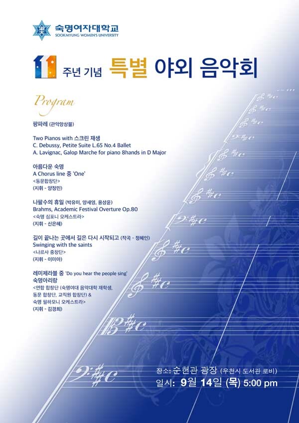 숙명여대 음악대학 관계자는 “오랜 역사와 전통을 자랑하는 대학으로서 음악회 개최가 지역사회와 함께 호흡하고 성장하는 계기가 되기를 기원한다”고 말했다.