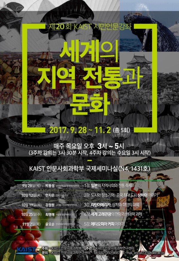 ‘세계의 지역 전통과 문화’를 주제로 열리는 이번 ‘제20회 KAIST 시민인문강좌’에는 순천향대 글로벌문화산업학과 박동성 교수 등 강사진 5명이 지역 전문가의 시선을 통해 본 일본·중국·라틴아메리카 등 세계 각지의 다양한 지역 전통과 문화 등에 관한 내용을 폭넓게 소개할 예정이다.
