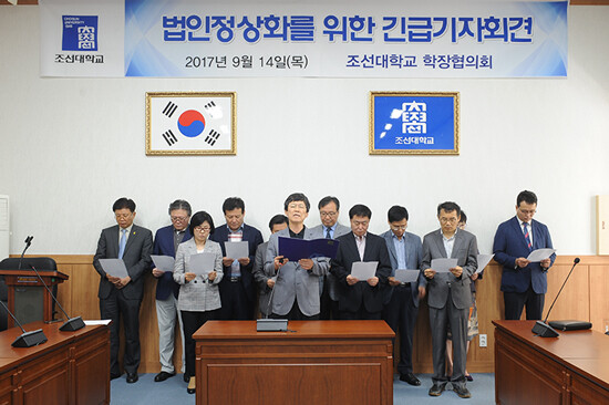 조선대 학장협의회는 14일 '법인이사회 정상화를 위한 긴급기자회견'을 열고 성명서를 발표, "조선대는 현재 이사회가 정상적으로 운영되지 못해 여러 가지 어려움에 직면해 있다"며 "이사회의 긴급사무처리권에만 의존한 파행적 운영은 학생들의 학습권, 교수들의 연구와 교육, 직원들의 행정업무 뿐 아니라 학교의 대외적 이미지를 심각하게 실추시키고 있다"고 말했다.