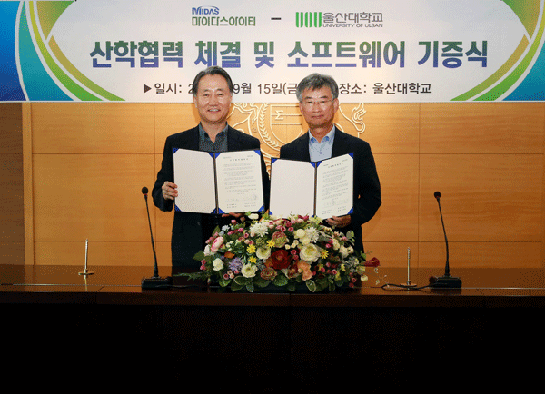 마이다스아이티는 건설용 구조엔지니어링 소프트웨어 분야 세계 1위 기업이다. 이날 울산대 교육 및 연구 활성화 지원을 위해 6억 1584만 원 상당의 소프트웨어를 기증했다.