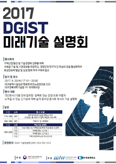 DGIST는 오는 20일 17시 10분 DGIST 연구행정동 국제회의장에서 '2017 DGIST 미래기술 설명회'를 개최한다.
