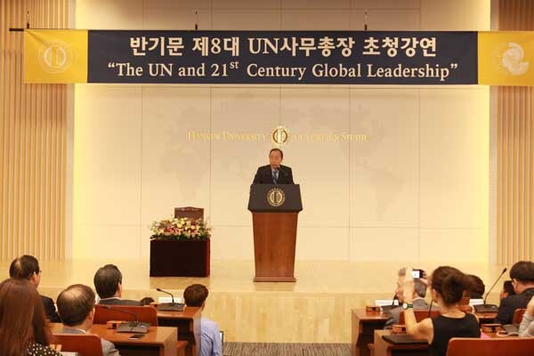 [대학저널 신효송 기자] 한국외국어대학교(총장 김인철) 국제지역대학원이 19일 한국외대 서울캠퍼스에서 반기문 전 유엔사무총장을 초청해 ‘UN과 21세기 글로벌 리더십’이라는 주제로 특강을 개최했다.