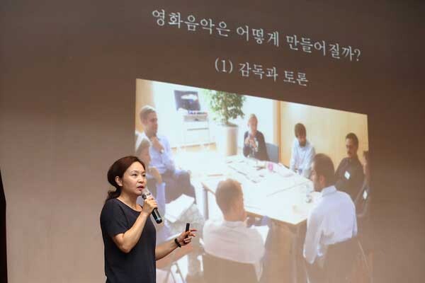 그는 ‘영화, 음악을 만나다’라는 주제로 음악이 어떻게 만들어지는지 그 과정을 설명하면서 강연을 시작했다. 다큐멘터리 ‘북극의 눈물’과 영화 ‘늑대 소년’의 영상을 본인이 작업한 음악과 함께 보여주면서 영화음악의 기능을 설명했다. 또한 자신이 영화음악가가 되기까지의 과정을 언급하며 “여자로서 어려운 일도 있었지만 끈기를 가지고 끝까지 버텼고 결국 사람들의 인정을 받아 내가 원하는 일을 할 수 있었다”라고 말했다.