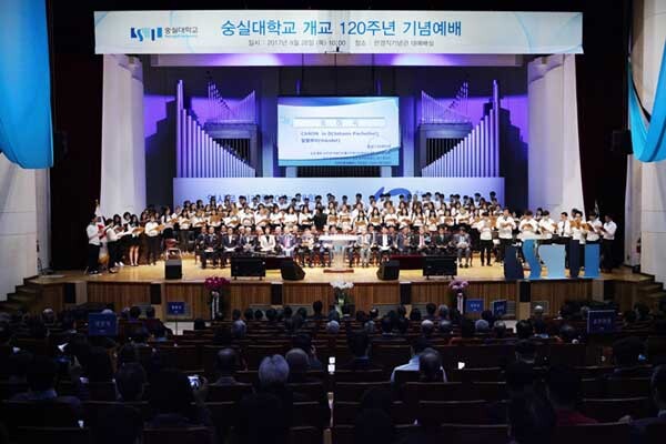 한편 숭실대는 1897년 선교사 윌리엄 베어드 박사가 평양에 설립한 '숭실학당'을 시작으로 1906년 우리나라 최초로 대학교육을 시행하고 1908년 대한제국으로부터 대학 인가를 받았다. 1938년 국내 대학으로는 유일하게 신사참배 강요에 맞서 자진 폐교를 단행함으로써 민족적 자존심과 신앙적 절개를 지켰다. 1954년 서울에서 재건돼 오는 10월 10일이면 120주년을 맞는다. 기념예배는 연휴로 인해 이보다 앞당긴 28일 진행됐다.