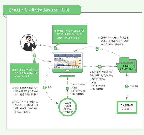 예를 들어 만일 어느 학생이 '반도체 관련 분야로 진출하고 싶은데 어떻게 하면 되느냐'는 질문을 채팅화면에 올리게 되면 에듀아이의 인공지능 시스템이 질문의도를 파악, 최적화된 답변을 제시한다. 시스템은 질문한 학생의 개인정보를 우선 수집한 뒤 반도체 분야 진출을 위한 교육과정 정보를 검색한다. 이를 토대로 해당 학생이 현재까지 이수한 교육과정은 무엇이며 앞으로 어떤 과정을 이수해야 하는 지 등의 내용이 상세히 안내된다.
