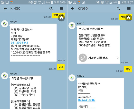 KINGO봇을 사용하는 방법은 매우 간단하다. 카카오톡 플러스 친구 검색창에서 KINGO(킹고)를 검색하고 친구로 등록한 후 채팅창에서 궁금한 내용을 입력하면 된다. KINGO봇은 사용자가 입력한 내용과 관련된 답을 제시, 언제 어디서든 필요한 정보를 얻을 수 있도록 하고 있다. 예를 들어 '셔틀버스'라고 입력하면 성균관대 셔틀버스의 현재 위치, 출발·도착 시간 등을 알 수 있다. '식당'이라고 입력하면 학생·교직원 식당의 위치와 운영시간, 연락처 등에 관한 정보가 나온다. '강의'라고 입력하면 강의평가 기간, 성적평가·강의평가 자료, 수강신청·수업자료 등에 관한 정보를 확인할 수 있다.