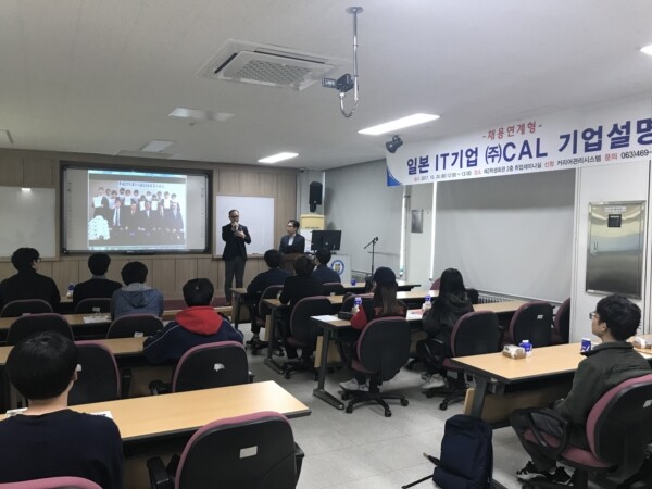 [대학저널 박용우 기자] 군산대학교(총장 나의균) 대학창조일자리센터는 지난 24일 일본해외취업에 관심 있는 재학생들을 대상으로 군산대학교 제2학생회관에서 주식회사 CAL 초청 기업설명회를 개최했다.