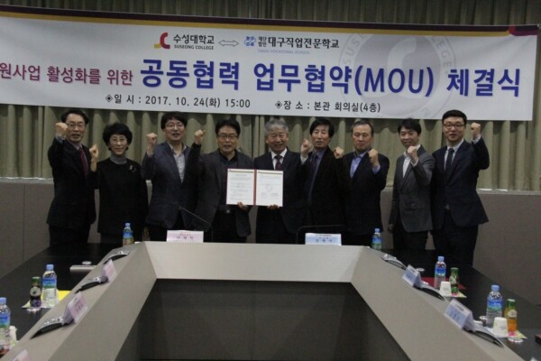 [대학저널 박용우 기자] 수성대학교(총장 김선순)와 (재)대구직업전문학교(이사장 강맹석)는 각종 일자리 취업지원 사업 등을 위한 협약을 24일 수성대 본관 회의실에서 가졌다.